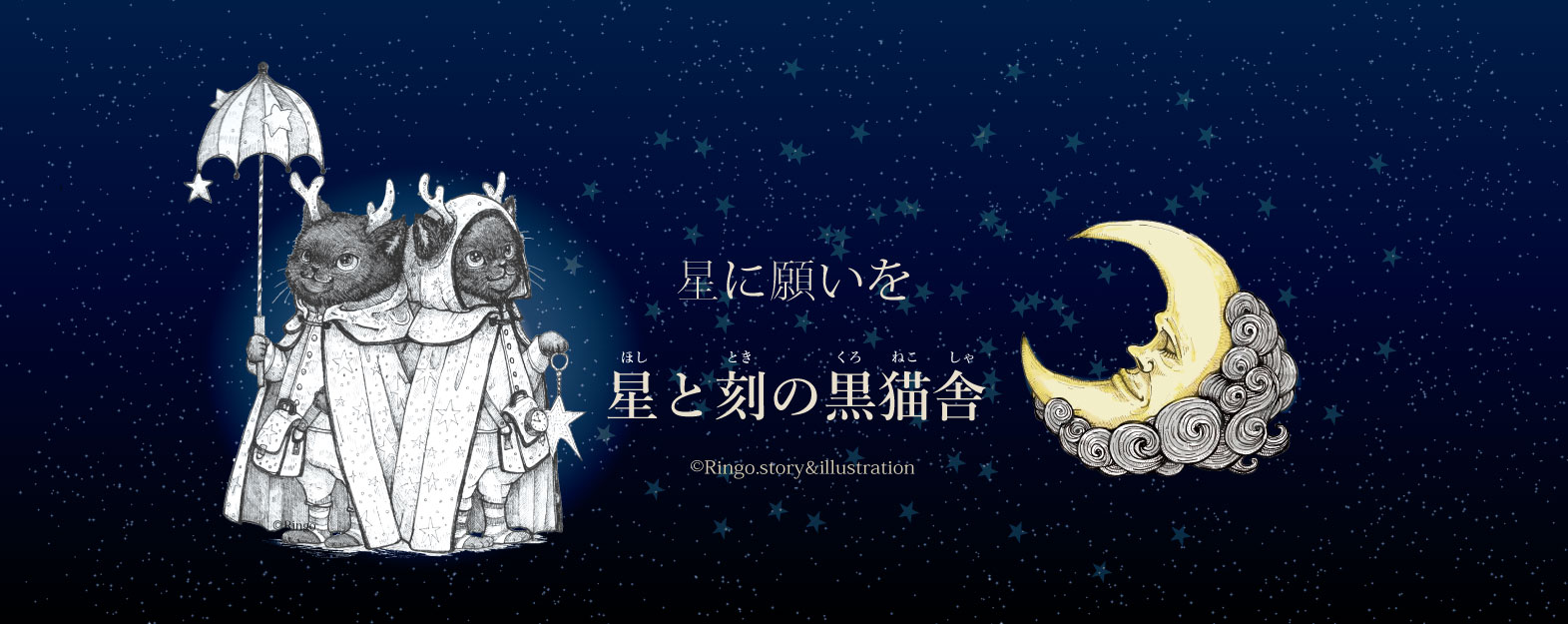 星のマントを纏い、星の鞄を携えた鹿のようなツノのある黒ねこの双子、星(ほし)と刻(とき)。今日も誰かの「どうか」の願いを届けに旅立ちます。